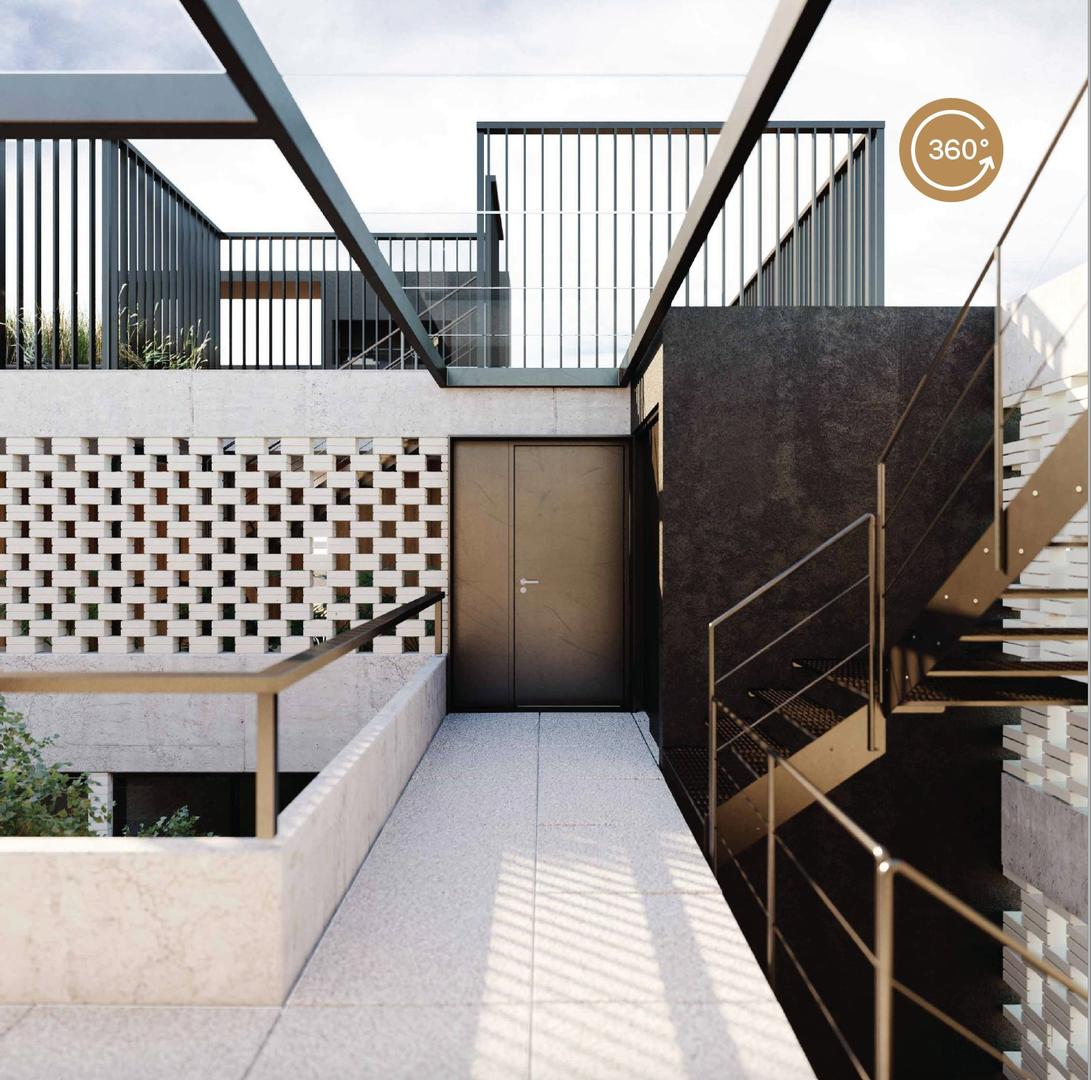 Materiales de concepto moderno: hormigón, ladrillos blancos vistos, chapa.